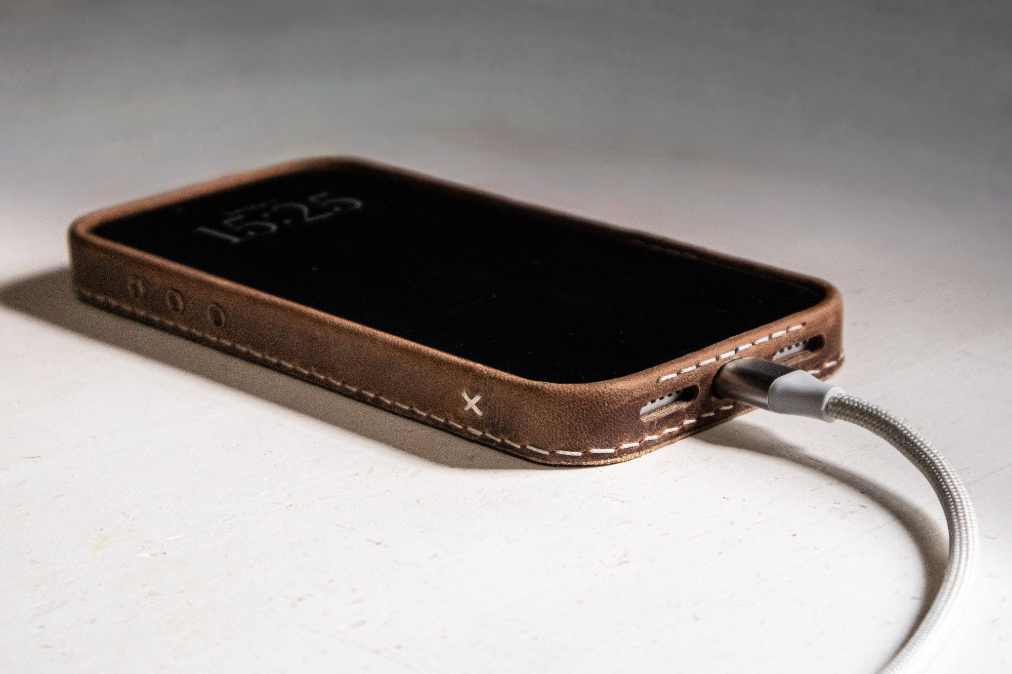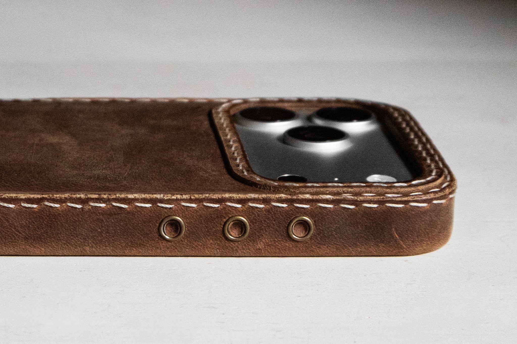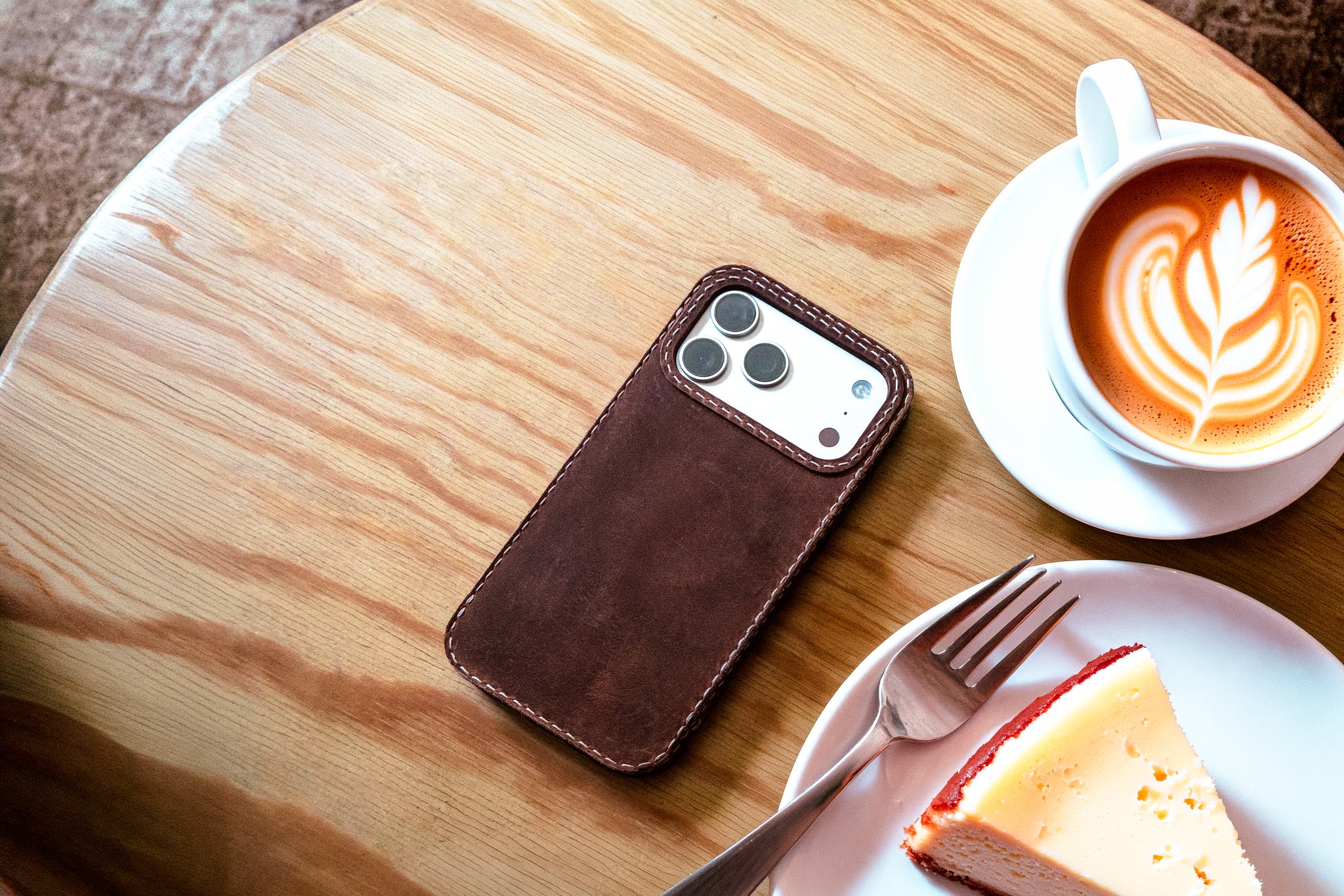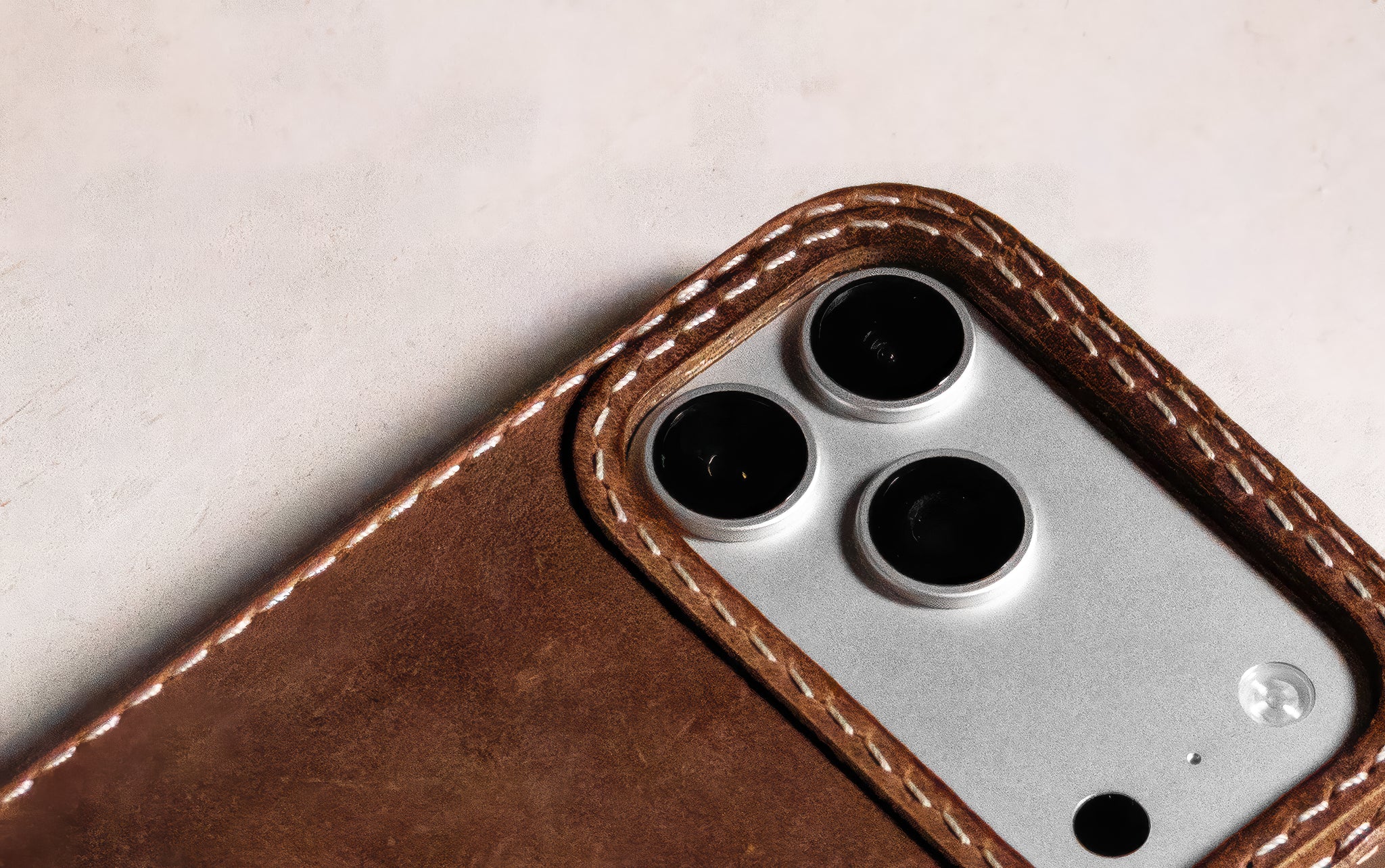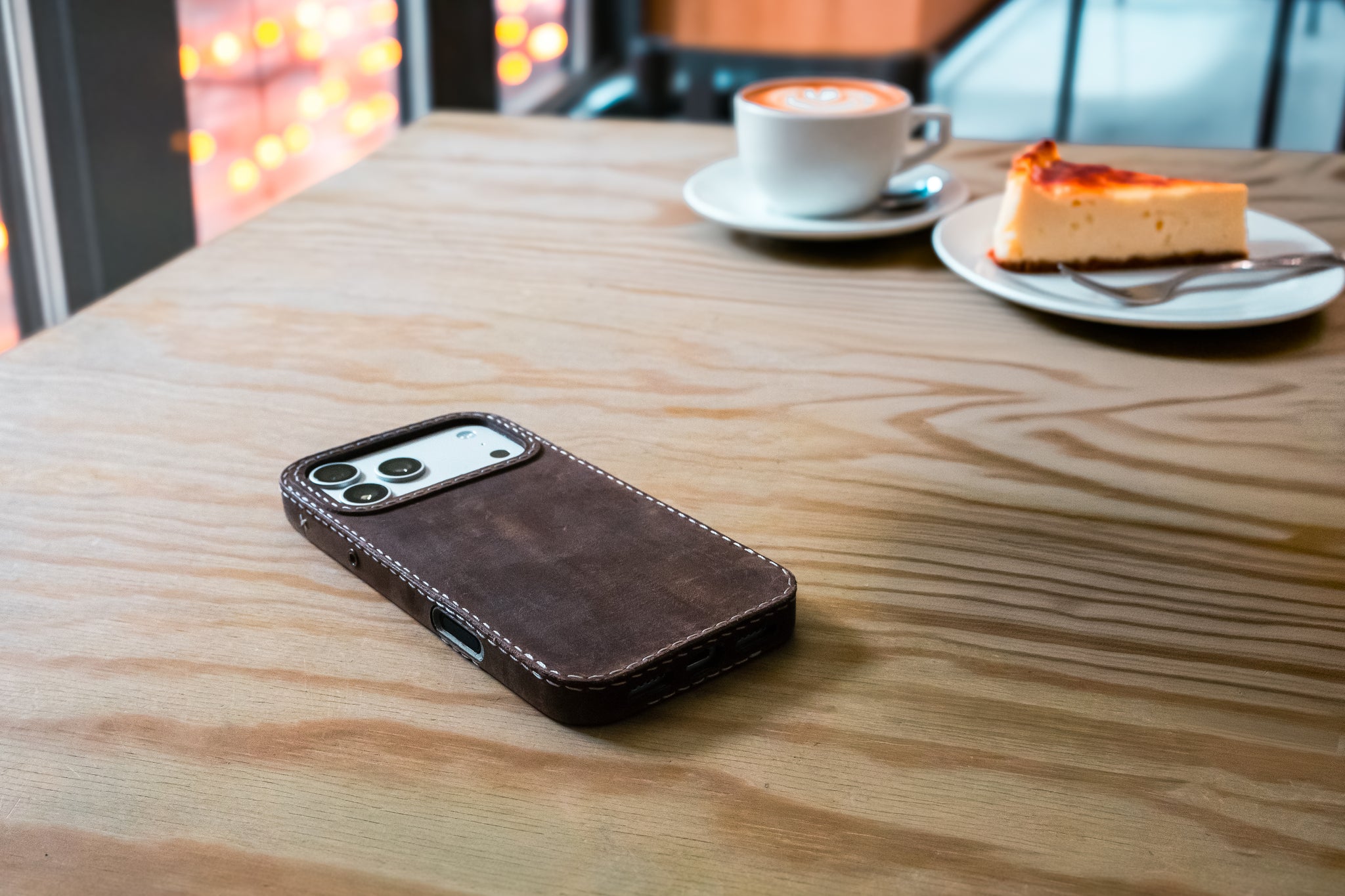 This leather iPhone case was cut and hand-stitched at my bench in my home studio, not assembled in a batch, but made individually, for you. Full-grain oil-waxed cowhide with a CAD-engineered internal frame: Camera Control accessible, MagSafe-ready, built to protect without the bulk.